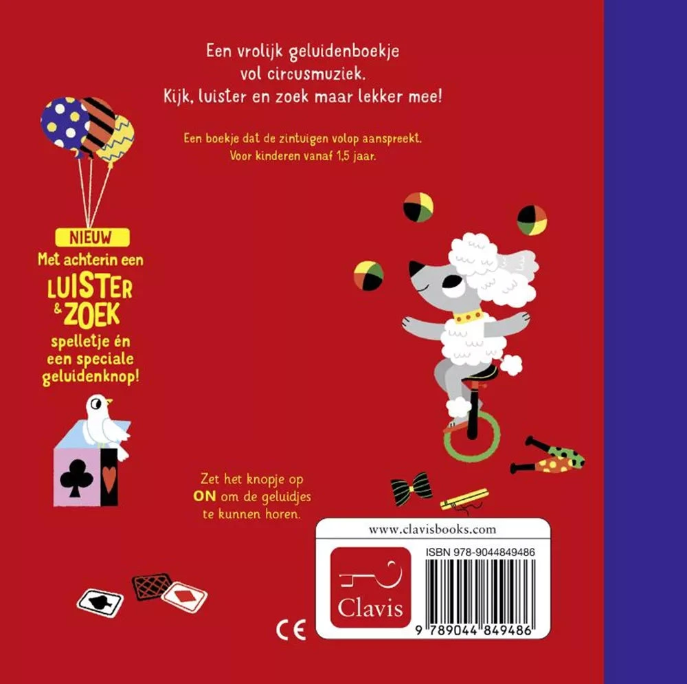 Een geluidenboekje met geluiden uit het circus. Welkom in het circus, de voorstelling begint! Kijk naar de goochelaar, de leeuwentemmer en en de olifanten. Bij elke circusact kun je een ander liedje afspelen.