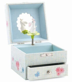 Een lief DJECO muziekdoosje met een wit konijntje en een spiegeltje. Wanneer je de muziekdoos laat spelen draait het sneewkonijn en hoor je het muziekje Let me call you sweetheart van Leo Friedman.