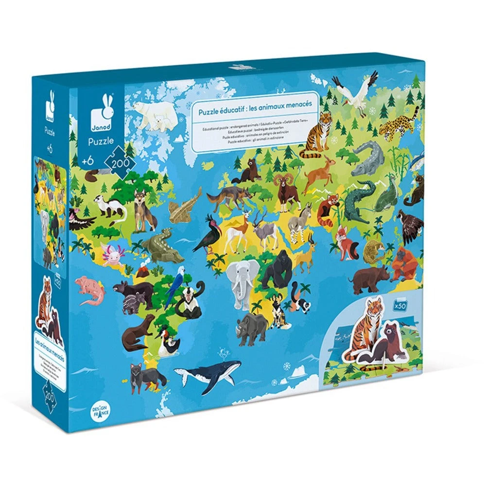 Een educatieve puzzel van JANOD met als thema bedreigde diersoorten, een puzzel voor kinderen vanaf 6 jaar. De kinderpuzzel met wereldkaart heeft 200 stukjes en 50 dierenfiguren en zit verpakt in een stevige bewaardoos.