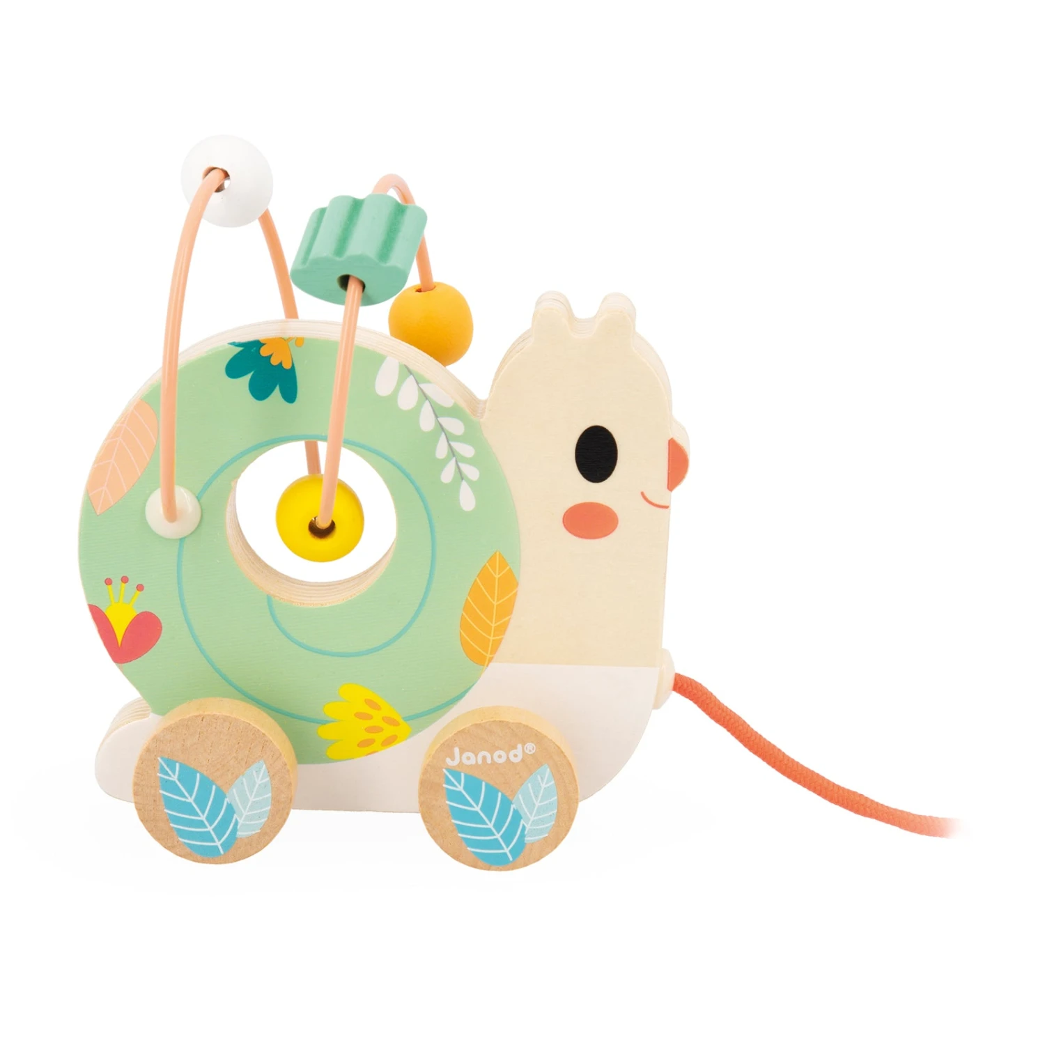 JANOD trekfiguur slak met een kralenframe met 4 kralen. Een houten speelgoed trekfiguur om de eerste stapjes van je kindje te stimuleren. Trek de slak achter je aan aan het koraalroze touw. Klaar met wandelen? Dan kun je de kralen over het frame laten glijden, de kracht van herhaling zorgt ervoor dat kinderen dit eindeloos kunnen doen.