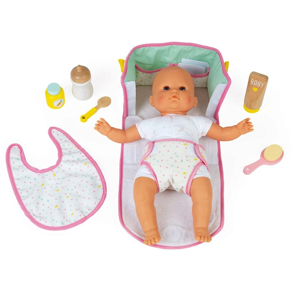 Heeft je babypop honger of een schone luier nodig? Dan vind je alles wat je nodig hebt in deze tas van 20 x 9 x 12.5 cm vol houten speelgoed verzorgingsproducten. Vouw de tas open en gebruik hem als verschoonmat. De pop wordt niet meegeleverd.