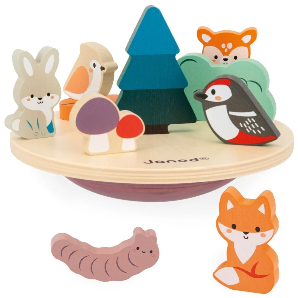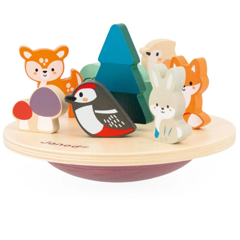 JANOD balansspel ecosysteem is een houten puzzel- en evenwichtsspel met bosdieren en bomen voor peuters vanaf 2 jaar. Zet het hertje, vogeltje en konijn op de wiebelende basis en zorg dat ze er niet afvallen!