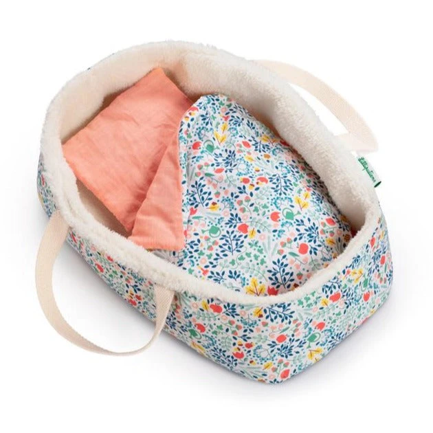 Lilliputiens reiswieg flowers, een stoffen poppenmandje om je Lilliputiens poppen en knuffels mee op pad te nemen. De reiswieg met bloemenrpint heeft een gevoerde binnenkant en hengsels om hem te dragen. In het poppenmandje zit een dekentje en kussentje op je poppen lekker onder te stoppen.