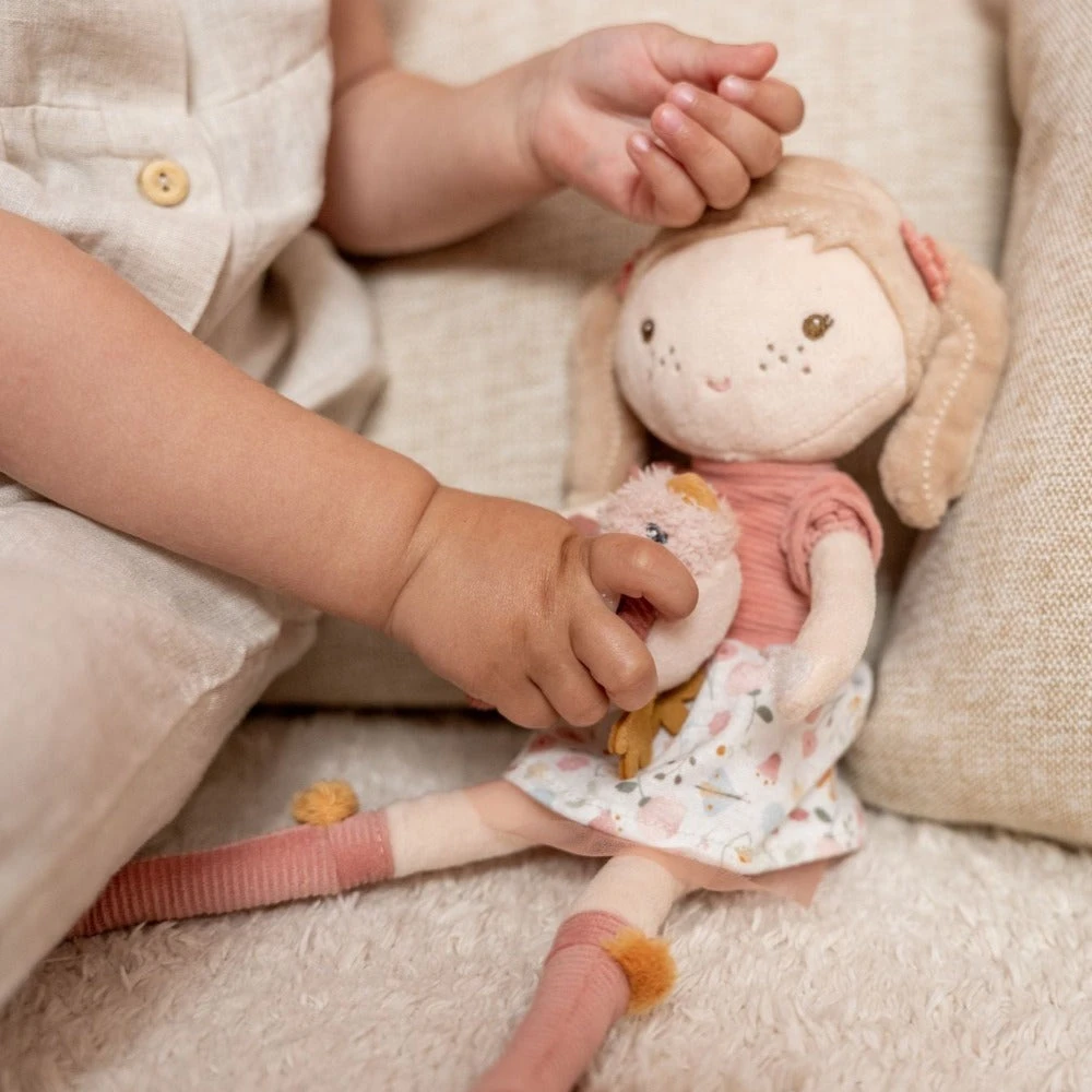 Little Dutch knuffel pop Anna is een zachte speelgoed pop van 35 cm voor kinderen vanaf 1 jaar. Anna heeft 2 staarten en sproetjes op haar wangen. Aan haar handjes zit klittenband waarmee ze het vogeltje stevig vasthoudt. Het vogeltje is los, het mooie gebloemde jurkje van Anna kan niet aan en uitgetrokken worden.