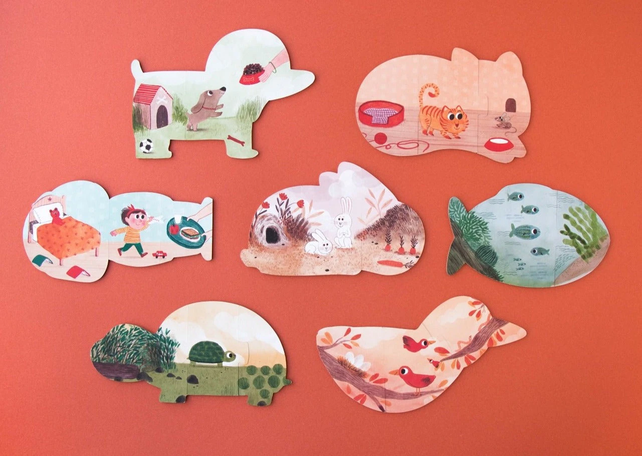De puzzels van I love my pets zijn extra groot, 7 x 13 cm, heel geschikt om zelf te leren puzzelen. Leg 3 puzzelstukken aan elkaar en vorm zo 7 verschillende huisdieren. De puzzel is aan beide zijden bedrukt. Aan 1 zijde leg je het huisdier, aan de andere zijde zie je het huisdier in zijn omgeving. De kat en hond worden gevoerd, de vis zwemt in het water.