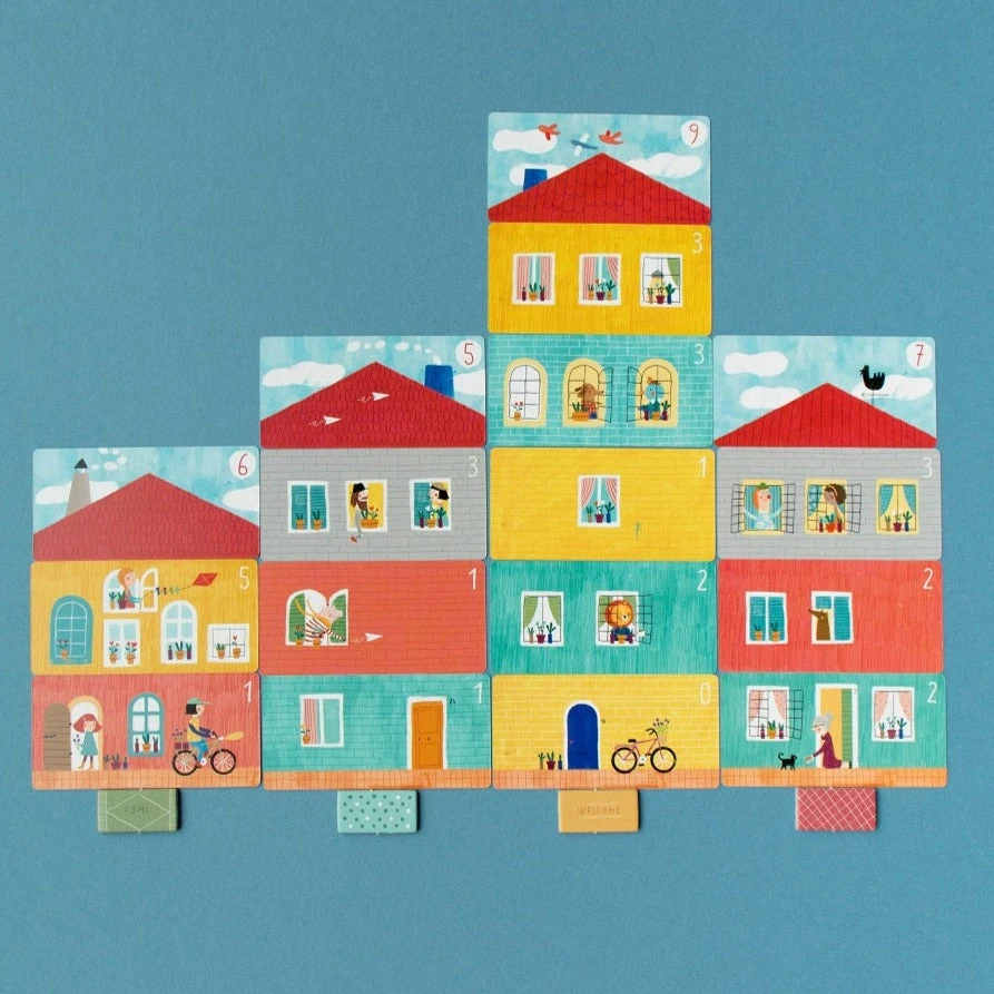 Kies een kleur deurmat, plaats een voordeur in het midden van de tafel en spelen maar! Heb je 2 deuren van dezelfde kleur? Dan krijgt je huis 2 verdiepingen. Plaats jij een dak op het huis? Dan mag jouw deurmat bij de voordeur en zijn de punten van het huis voor jou. Dit spel vraagt enige oefening maar wanneer je de regels eenmaal doorhebt kun je het eindeloos spelen.