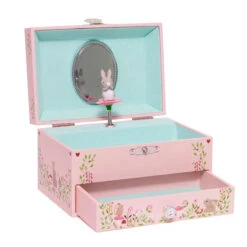 Aan de buitenkant van de bijoux doos zie je verschillende bosdieren, eekhoorns, konijntjes, een uil en zie je het muisje? Geillustreerd door Rebecca Jones. Open de deksel en het konijntje komt tevoorschijn op een bloem. De muziekdoos heeft een laatje, hierin bewaar je nog meer moois.